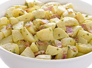 * Αλατίζετε τις πατάτες και τις απλώνετε σε ένα ταψί ανακατεύοντας με το μπέικον και το κρεμμύδι.